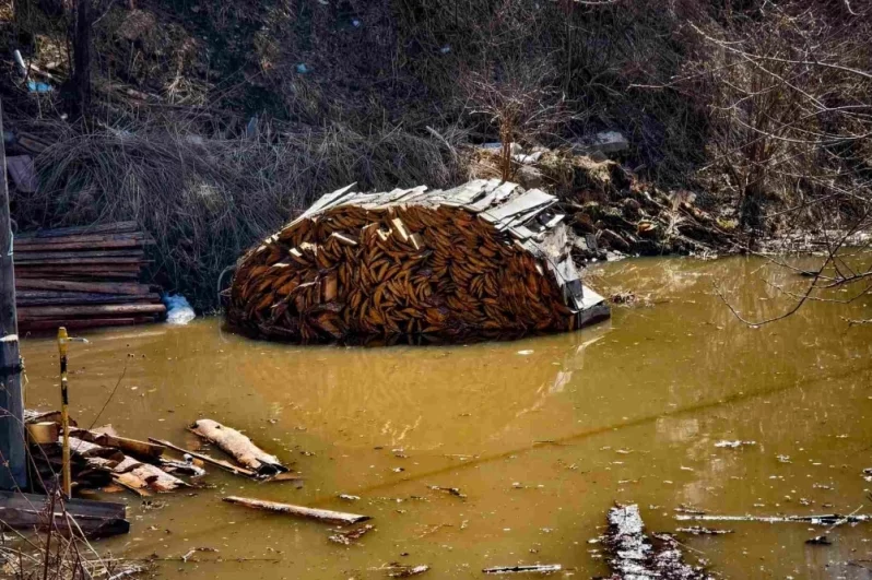 Сейчас там работает помпа — техника громко тарахтит, пытаясь справиться с потоком, но участки остаются затопленными. Вода стоит почти по колено. На одном из подтопленных участков мы заметили одинокую собаку, которая бродит по своей конуре, будто не понимает, куда делась привычная суша.
