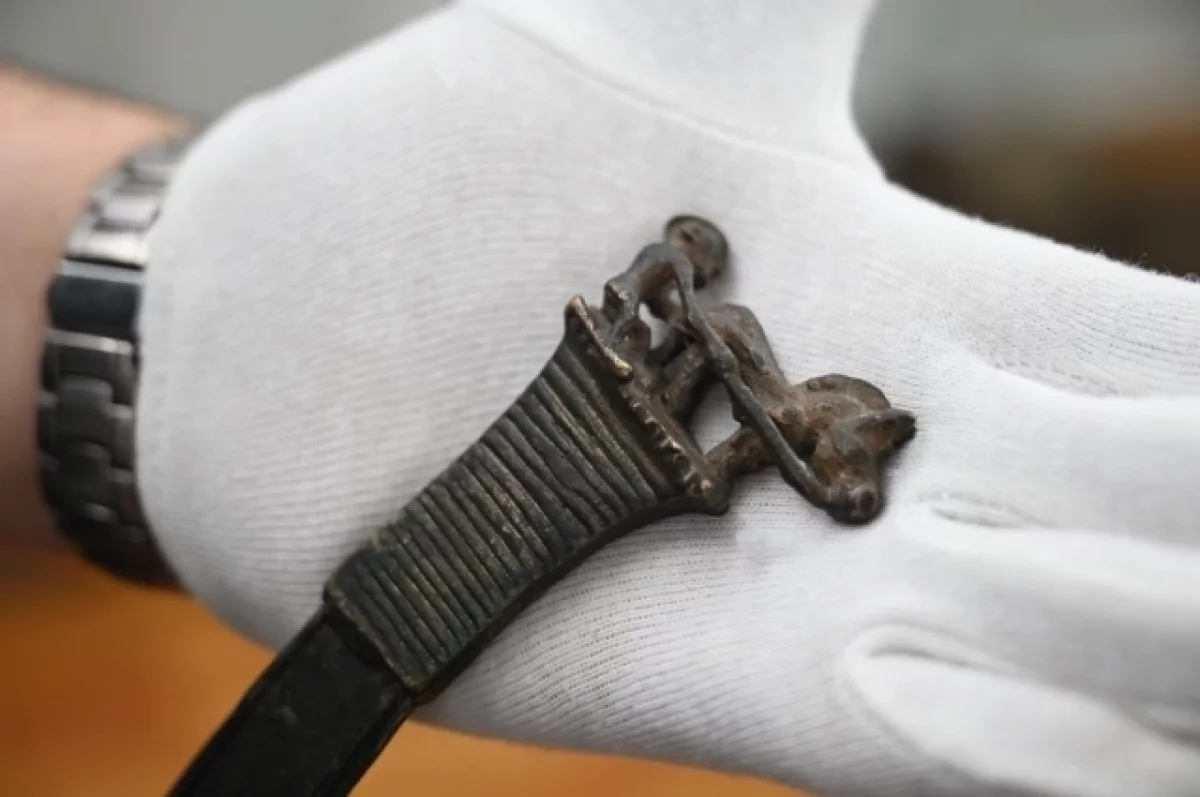 «Если на других подобных ножах, найденных на огромном пространстве от Балтии до Китая, изображены животные, то на нашем экземпляре красуется миниатюрная, но отчетливая фигурка человека на лыжах, на лошади, удерживающего лошадь за вожжи», — поясняет заведующий музеем Илья Коробейников.