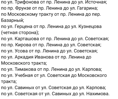 Также с полуночи до 21.00 ограничение движения будет действовать по пер. Спортивный от пр. Ленина до ул. Советская; по ул. Гагарина от пр. Фрунзе до пер. Спортивный; по пер. Спортивному от ул. Советская до пр. Фрунзе; по ул. Советская на участке от пр. Фрунзе до ул. Герцена (с возможностью движения электротранспорта с 18.00).